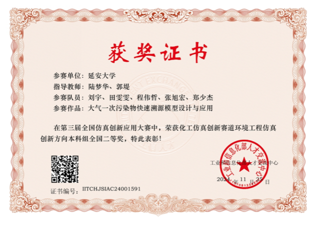 11月24日,由国家工业和信息化部主办的2024年全国仿真创新应用大赛全国总决赛在西安落下帷幕,我院在此次全国仿真创新应用大赛中取得佳绩。由环境工程系陆梦华、郭堤老师指导,环境工程专业本科生刘宇、田雯雯、程伟哲、张旭宏和郑少杰完成的作品“大气一次污染物快速溯源模型设计与应用”荣获该赛事国家级二等级。