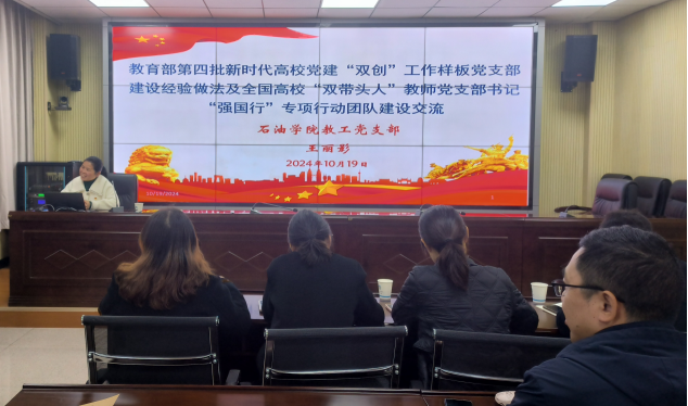 会上,王丽影就石油学院教工党支部在党建方面的创新举措及全国高校“双带头人”教师党支部书记“强国行”专项行动方案做了详细介绍。党支部构建并实施了“党课N+”延安精神教育工程、“五微一体”理论学习工程、规范化系统化制度建设工程、“四亮”先锋党员建设工程、“二三四”党建业务互融工程,支部委员“头雁”领航工程、“困难师生”结对帮扶工程、“网格化”党员服务工程和“立体化”党建宣传工程九大特色工程,并以这九大工程为抓手,健全五大运行机制,最终将党支部建设成为“学习型”“创新型”“服务型”三型党支部,形成“三五九”党建工作体系,打造新时代延安精神“加油站”党建工作样板支部。党支部以党建创新工作为基础,结合党支部在教学科研方面的成果,凝练“延安精神+”系列成果,形成“延安精神+”教育品牌和“延安精神+”服务品牌,切实推进全国高校“双带头人”教师党支部书记“强国行”专项行动,为祖国加油,为民族争气。