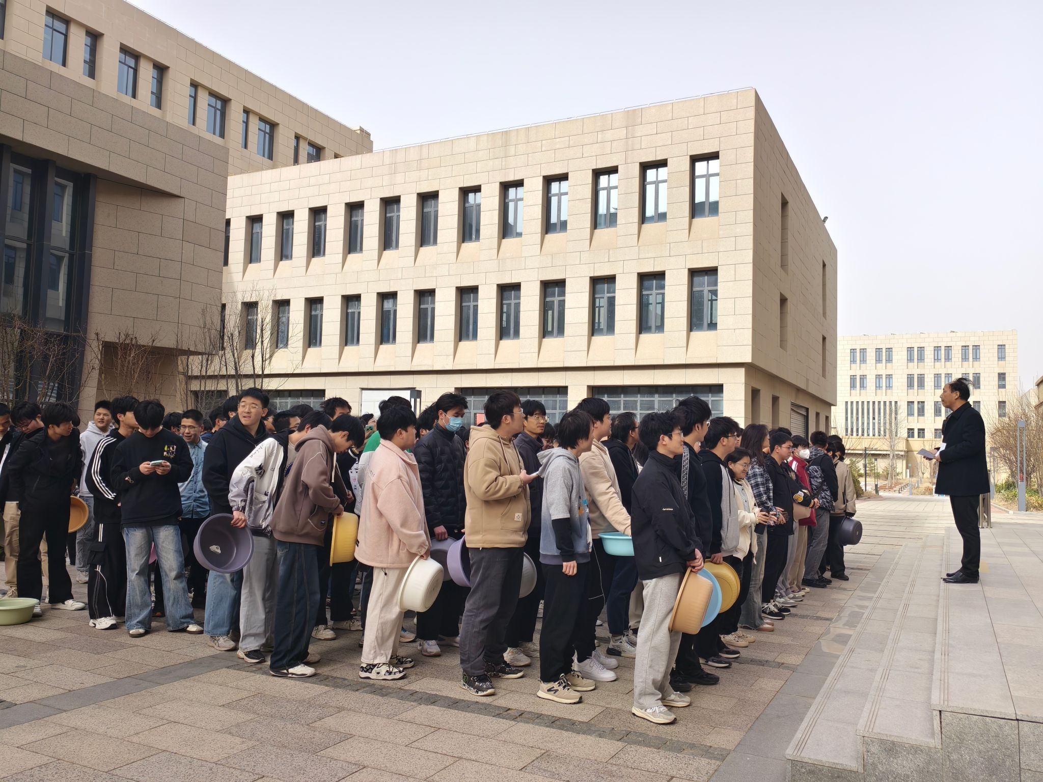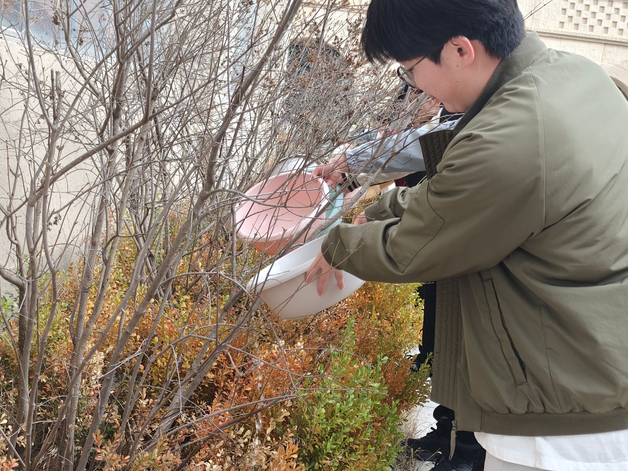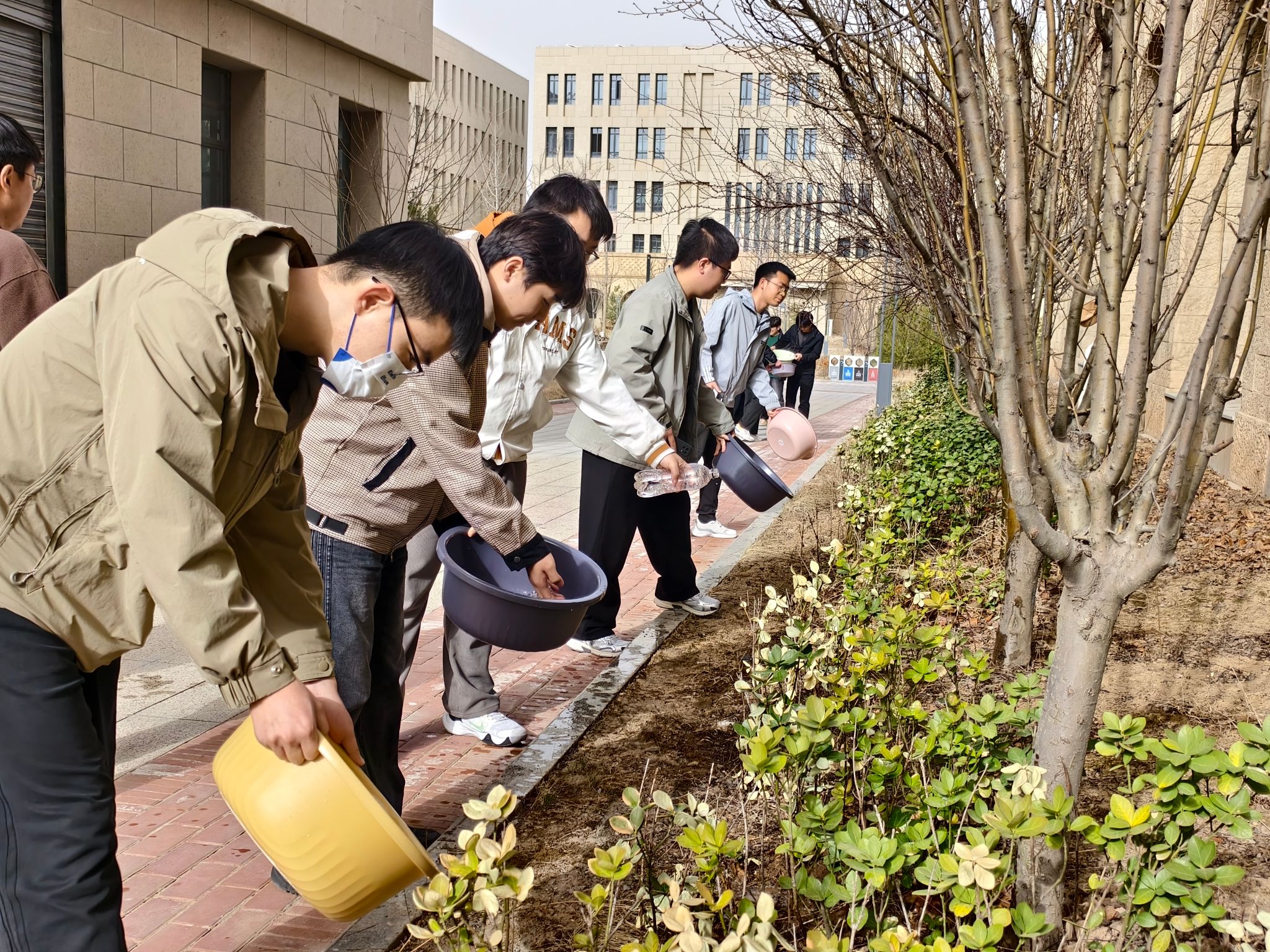 在接水处,同学们排成整齐的队伍,井然有序,他们端着装满对校园绿化热忱与期望的水盆穿梭在树木花丛间,水流均匀地洒在树木花草中。同学们齐心协力、相互配合,经过1小时奋战,共同为学院周边区域树木花草送去生命的源泉。