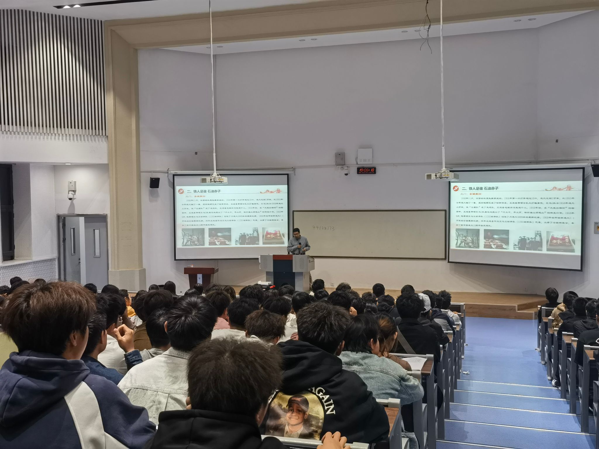 报告会上,张伟以铁人精神为引领,从中国石油工业常识、铁人精神的内涵意蕴及铁人精神带来的重要启示等方面,通过生动的故事、丰富的图片以及立意高远的诗词,将全体学生带入了“铁人”王进喜跨越时代的奋斗历程。他详细解读了铁人精神的丰富内涵,展现了以王进喜为代表的石油人身上所蕴含的坚韧不拔、顽强拼搏的壮志豪情。最后,铁人精神对青年学子的启示将报告会推到了精彩高潮,他倡议全体学生做学文化、悟思想、敢担当、建新功的时代新人,以铁人精神为榜样,不断锤炼意志品质,锻造优良学风,助力学生成长、成人、成才。