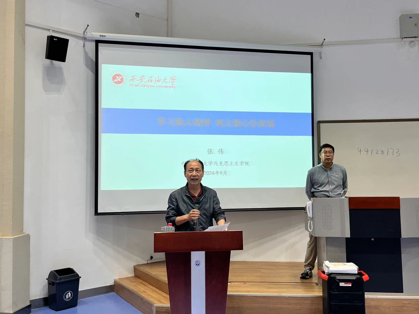为做好2024级新生入学教育,加强新生对所学专业的认同感,使铁人精神内化为大学生的价值追求、外化为大学生的行为自觉,9月27日晚,石油学院邀请西安石油大学马克思主义学院党总支书记张伟为2024级新生作题为“学习铁人精神 树立核心价值观”的专题报告,学院党委副书记牛保明、新生辅导员郭洒洒及全体2024级本科生和研究生参加了报告会,报告会由牛保明主持。
