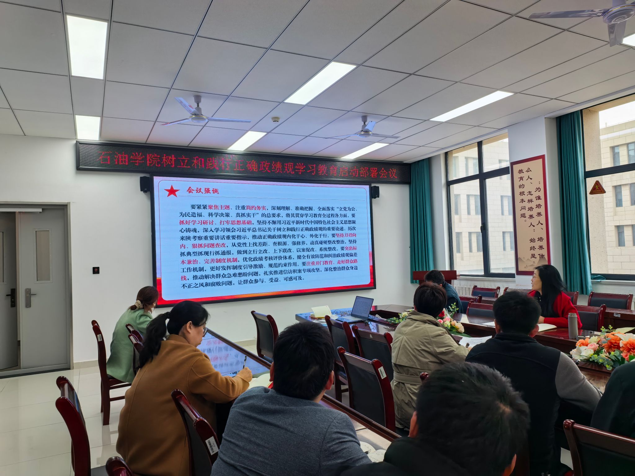 为深入学习贯彻习近平总书记关于树立和践行正确政绩观的重要论述,全面落实中央、省委及校党委工作部署,3月13日下午,石油学院在会议室召开了树立和践行正确政绩观学习教育启动部署会议。学院党委委员、领导班子成员、全体科级干部和各党支部书记参加了会议,会议由院党委书记常佩艳主持。