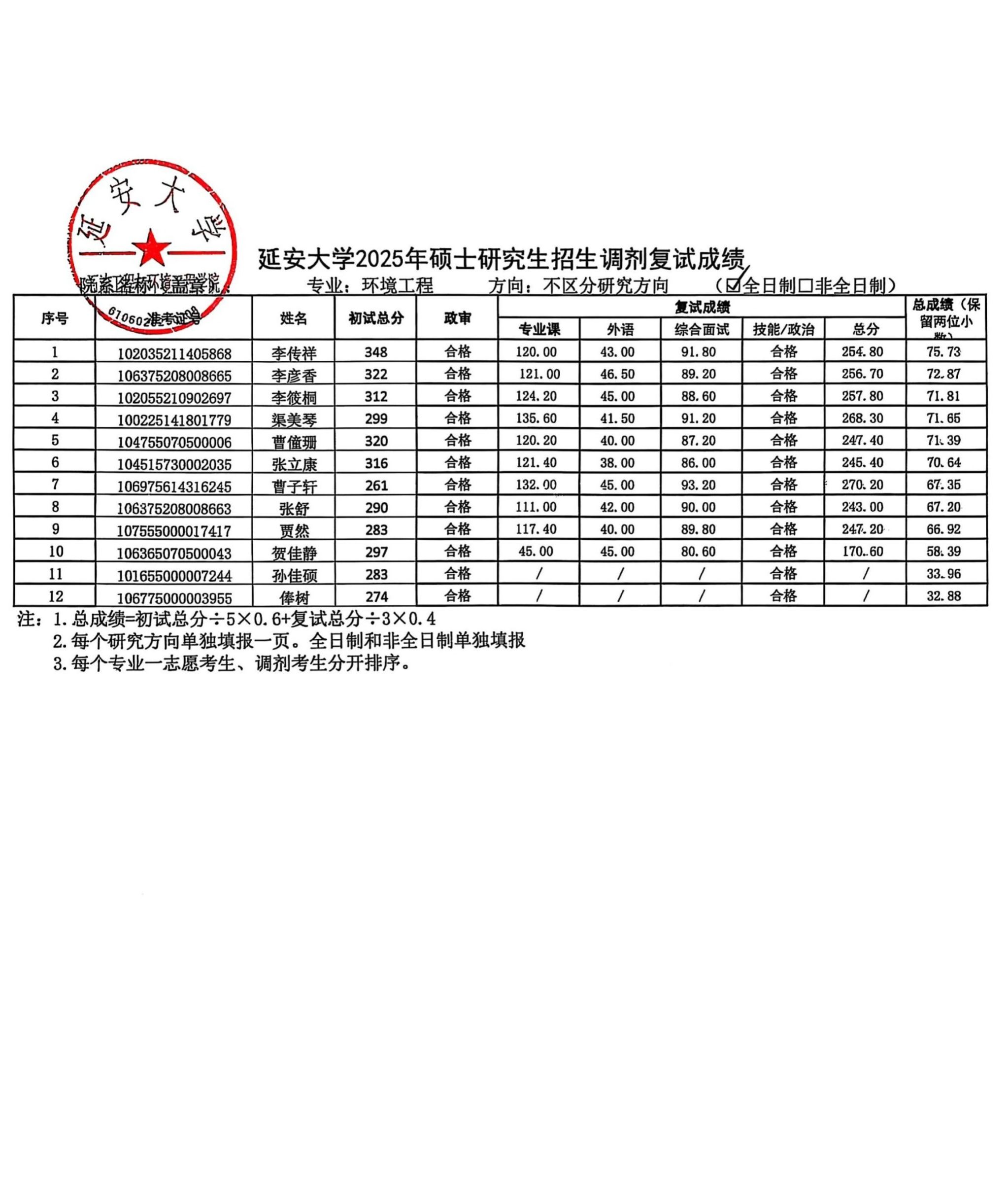 石油学院2025年硕士研究生招生调剂考生复试成绩公示(环境工程)