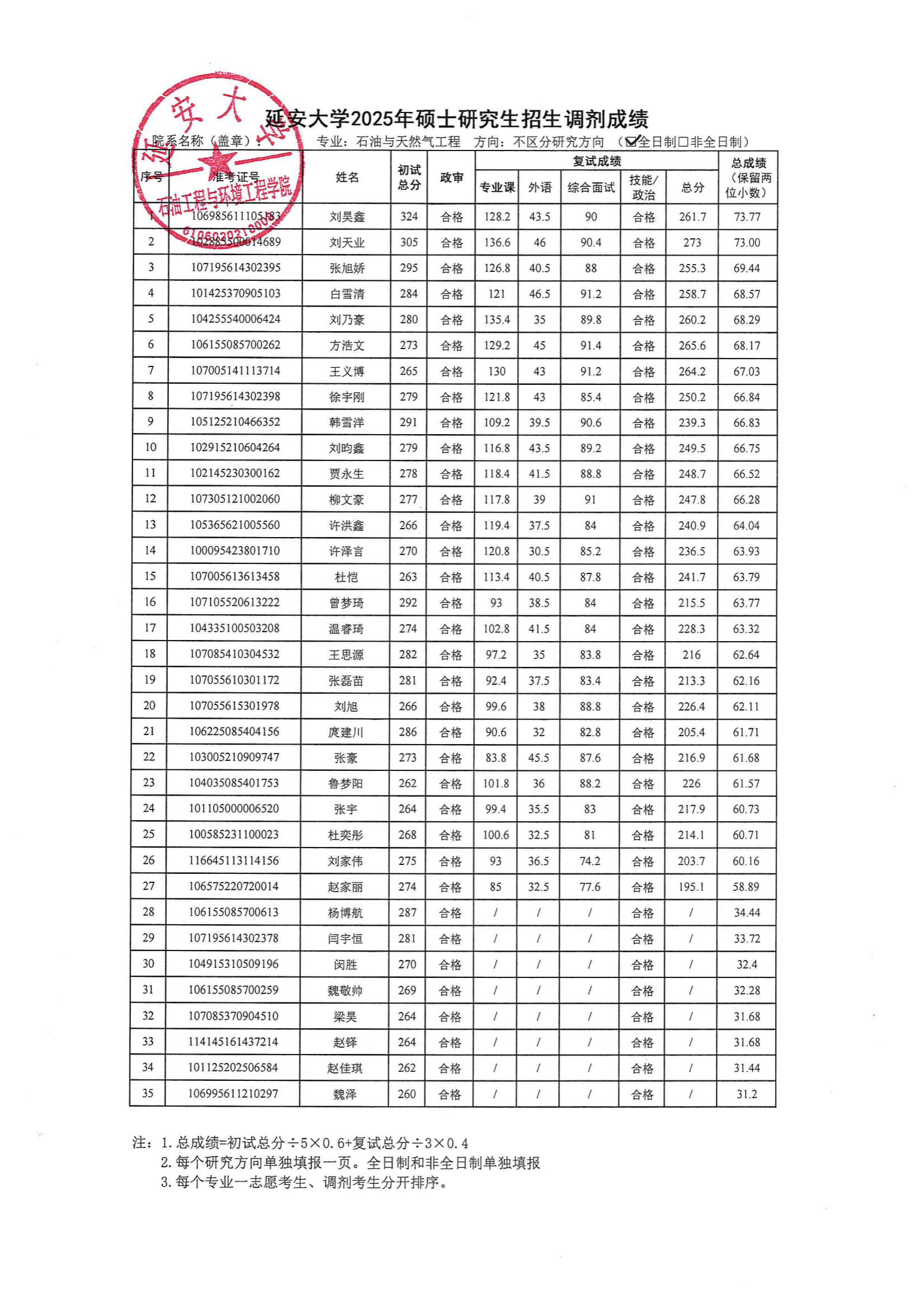 石油学院2025年硕士研究生招生调剂考生复试成绩公示(石油与天然气工程)