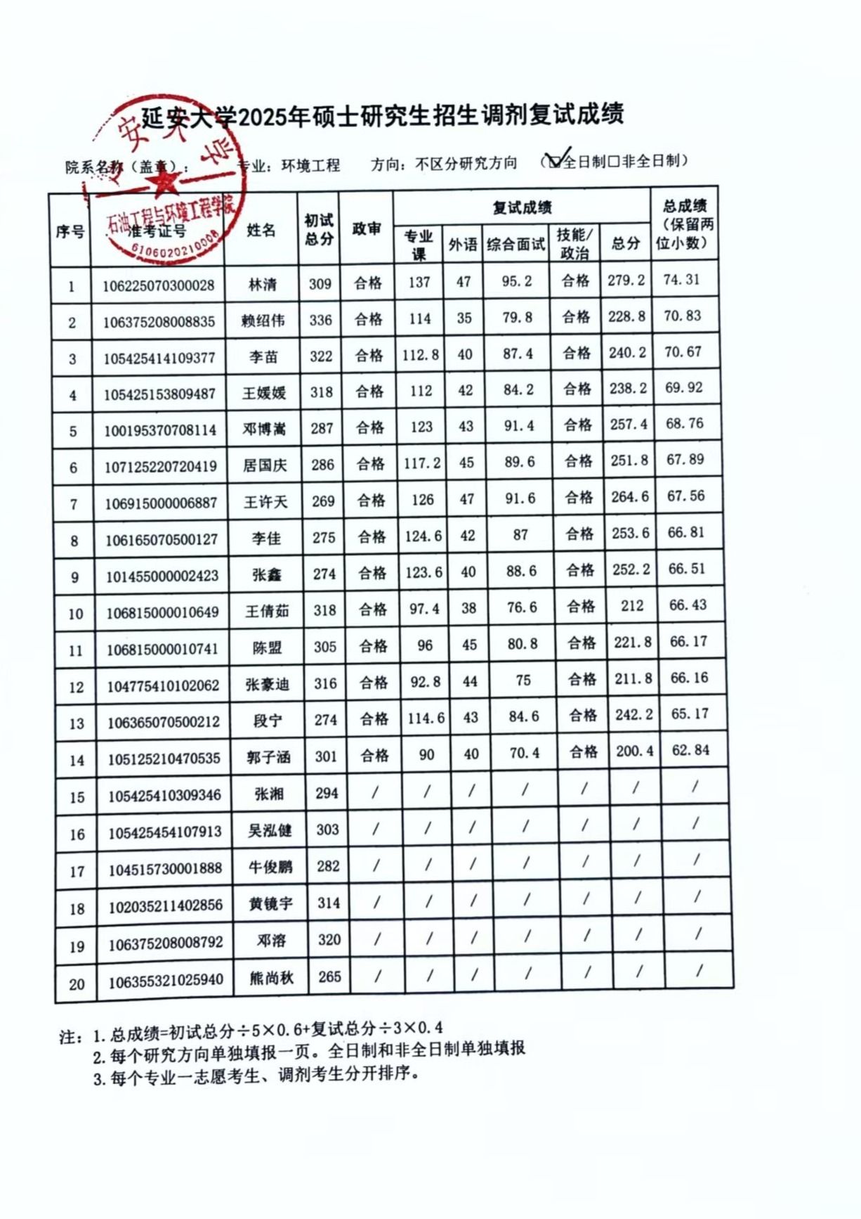 石油学院2025年硕士研究生招生第二批调剂考生复试成绩公示(环境工程)